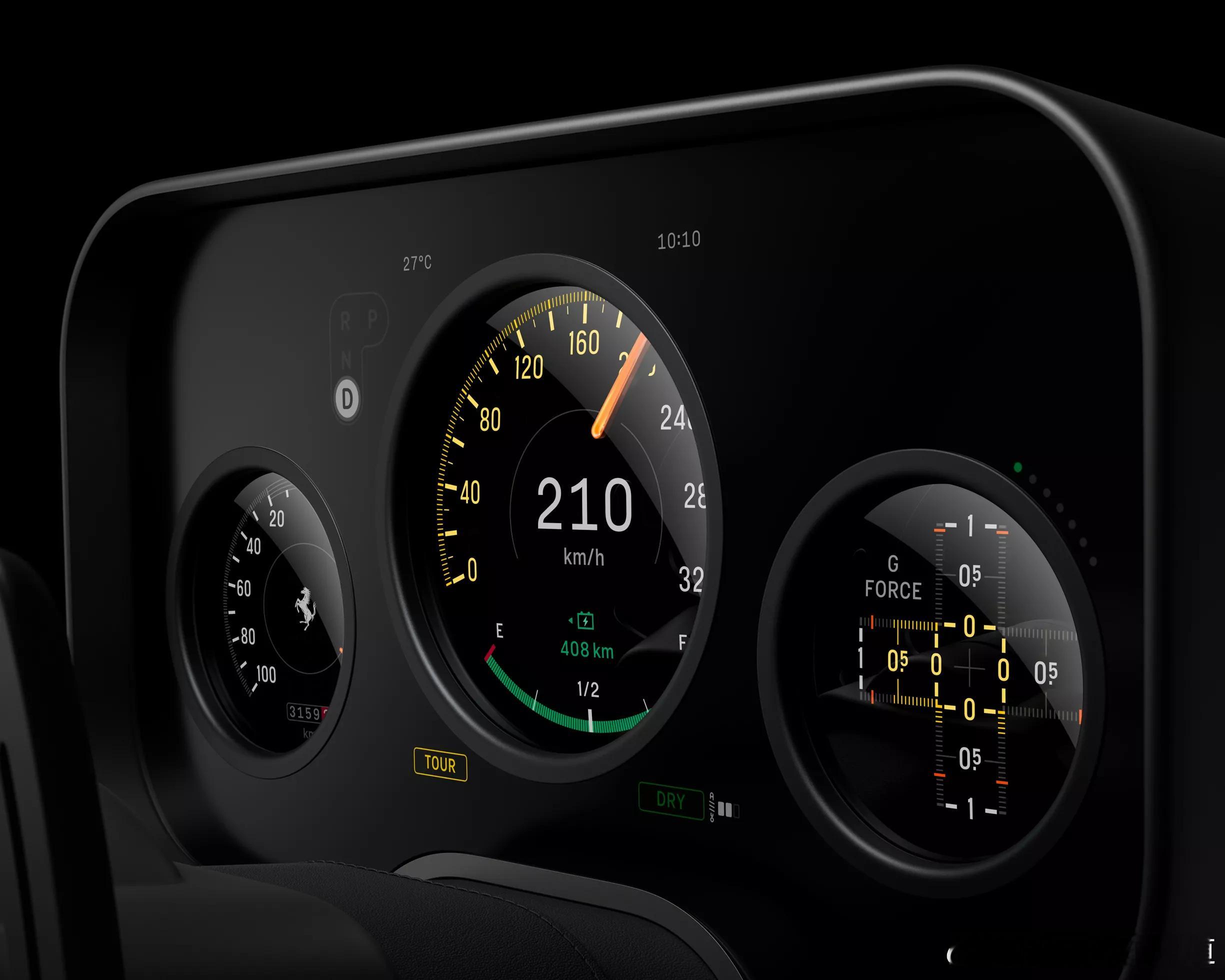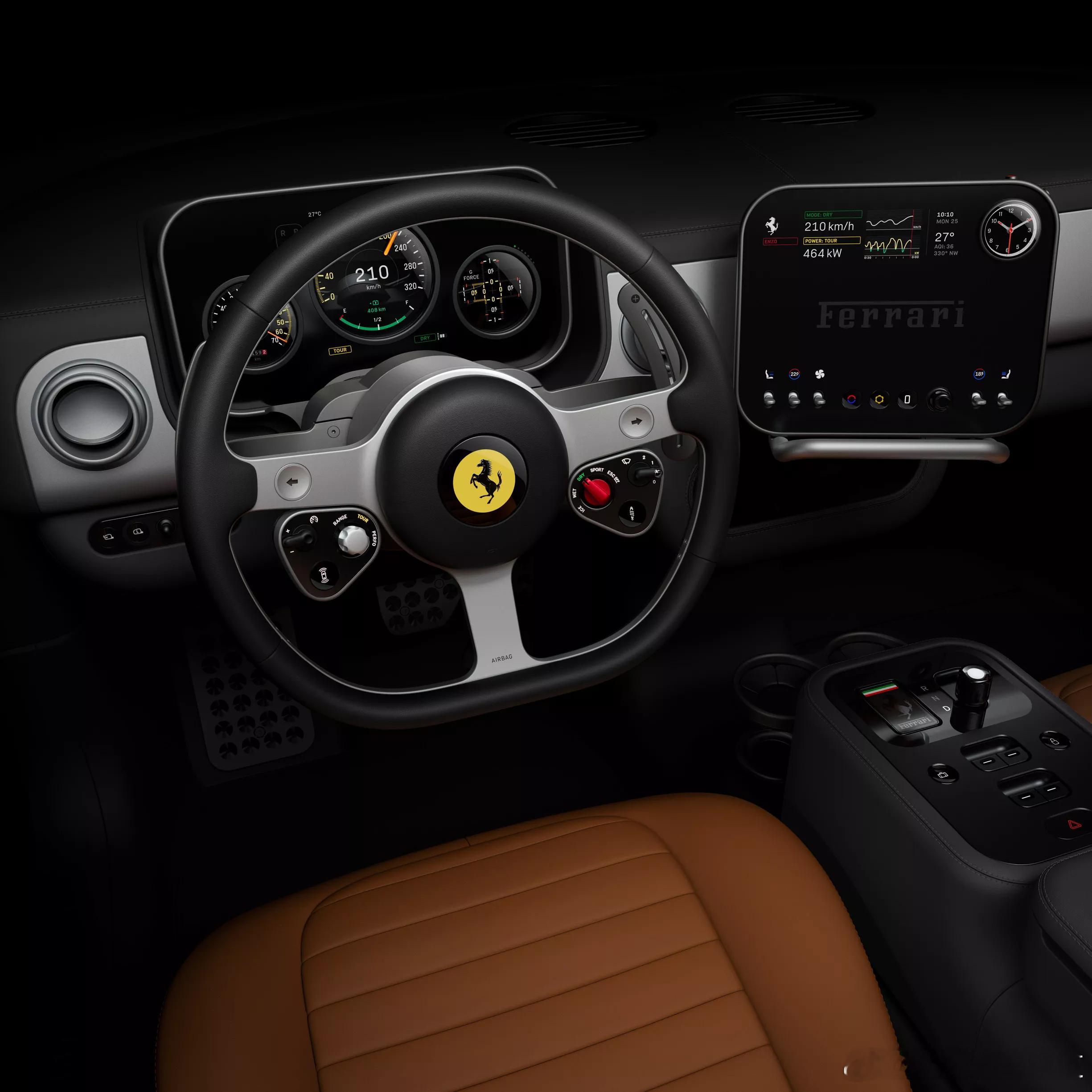 胖哥汽车频道 法拉利首款纯电车型内饰曝光 定名"Luce"(意为"光芒"),将于5月在意大利首发。作为法拉利电动化转型的产品,你认为百万级纯电超跑能否延续品牌传统驾驶乐趣?车内设计由苹果前首席设计官Jony Ive创立的LoveFrom团队主导,采用复古与现代融合的设计语言:三辐式方向盘致敬50-60年代Nardi经典设计;创新性地将仪表盘集成于转向柱,可随方向盘同步转动;定制化OLED显示屏采用三星联合开发的超薄面板,带有三处特殊开口增强立体视觉效果;中央控制面板可自由旋转面向驾驶者或乘客;换挡机构采用Corning Fusion5玻璃材质,为汽车行业首次应用。法拉利Luce
