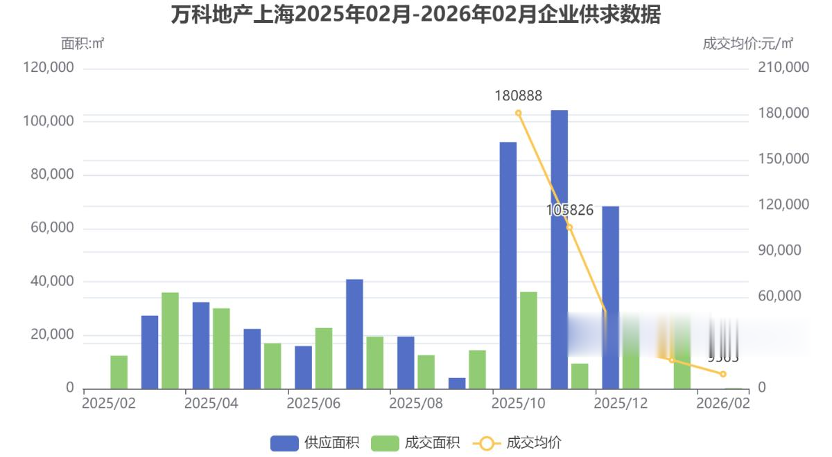 数据来源于克而瑞。图表显示,2025年10月万科上海单月成交金额高达65.5亿元,主要源于高单价项目集中网签;但进入2026年后,成交建面与均价双双回落,反映市场去化节奏放缓,公司策略转向存量盘活而非新增扩张。