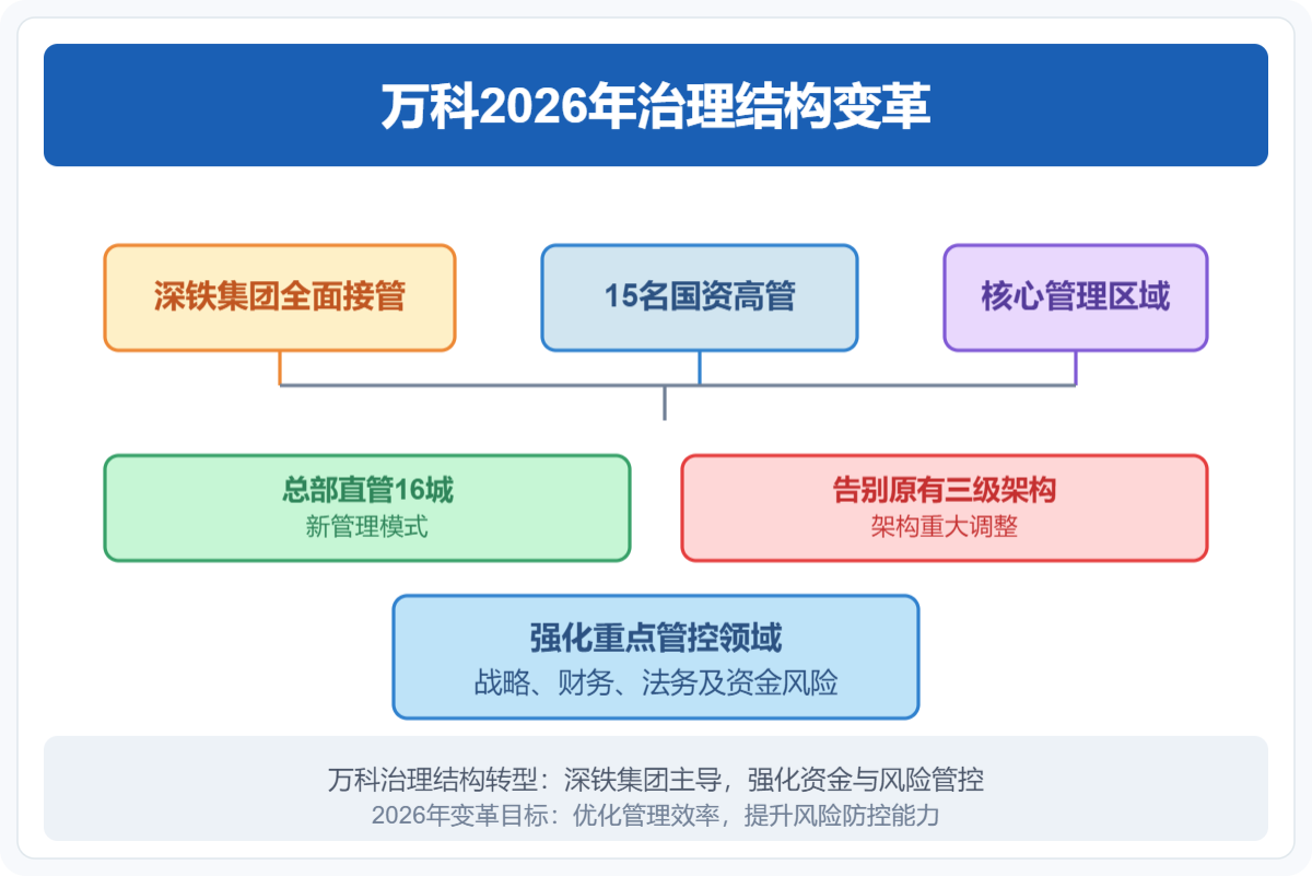 2025年底至2026年初,万科管理层迎来大规模调整。原董事长郁亮、总裁祝九胜相继辞职,深铁集团董事长辛杰接任董事会主席(后由黄力平接替),15位具有深圳国资背景的高管全面入驻总部及核心区域公司。