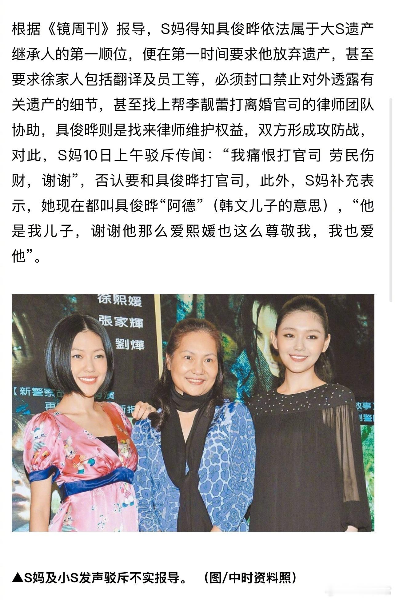 S妈否认和具俊晔争大S遗产:“我痛恨打官司,劳民伤财。” 并补充道:“他是我儿子,谢谢他那么爱熙媛也这么尊敬我,我也爱他。”