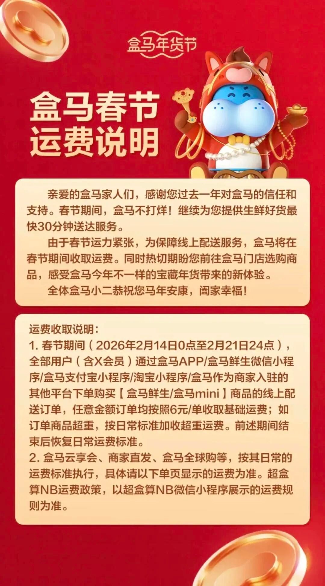 盒马则宣布,2026年2月14日0点至2月21日24日期间,所有用户在盒马APP、微信小程序、支付宝小程序、淘宝小程序及盒马入驻的其他平台购买盒马鲜生、盒马mini商品并选择线上配送的,无论订单金额多少,基础运费统一按6元/单收取,超重部分仍按日常标准加收,假期结束后恢复原有运费规则。