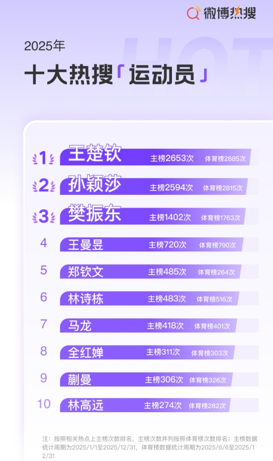 直播吧02月10日讯今日,微博热搜公布了2025年体育行业热搜趋势报告,其中公布了2025年十大热搜运动员。其中乒乓球运动员多达8人霸榜,王楚钦、孙颖莎、樊振东位列前三。