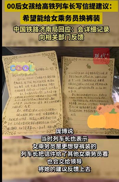 关于铁路女乘务员该穿裙装还是裤装的讨论成了网络上的热门话题,起因是一位乘客在乘坐高铁时,发现女乘务员穿着短裙工作,觉得不太方便,于是提出了将裙装换成裤装的建议。 这位乘客名叫庞博,是个00后的年轻女孩,刚硕士毕业工作半年。那天她搭乘高铁回山东老家,车程大概四个小时。上车没多久,她就注意到女乘务员们都穿着统一的裙装制服,搭配着肉色袜子,也就是大家常说的“光腿神器”。在庞博看来,这样的装扮虽然看上去整齐美观,但实际工作起来可能并不舒适。特别是当乘务员需要弯腰为旅客调整座椅,或者穿梭在车厢过道时,裙装显然不如裤装方便灵活。 于是,庞博拿出随身携带的纸笔,写了一封信给列车长,表达了自己的想法和建议。她认为,职业装应该首先考虑舒适性,毕竟乘务员的工作需要频繁走动和弯腰,裤装会更适合。这封信后来被庞博发到了社交平台上,没想到一下子引发了众多网友的共鸣,点赞数超过了2万次。 面对这样的建议和讨论,铁路部门也给出了回应。记者采访了该列车的担当路局济南局,专属客服表示,济南局对于列车工作人员着裙装还是裤装并没有明确规定。目前的要求是列车工作人员的服装必须统一,穿着正常的铁路制服。高铁为了展示形象和服务的一流性,特意为高铁乘务员定制了裙装作为品牌服。不过,客服也强调,对于热心网友的反馈,他们会详细记录,并向相关部门反馈,经过综合考量后,在更换服装的时候做出统一规定。 其实,这并不是第一次有人提出这样的建议。之前就有网友在12306平台上反映过类似的问题,认为女性列车乘务员的裙装在弯腰工作时容易走光,且不如裤装方便。12306的客服当时也回应说,铁路方面并没有明确规定女性列车乘务员必须穿裙子,但要求统一着装,穿着得体,裤子或者裙子都可以。 这场关于女乘务员着装的讨论,其实反映了大家对于职业装舒适性和美观性的不同看法。有人认为职业装应该先谈舒适性,再谈美观度;也有人觉得裙装更能展示女性的美好形象。不过,无论最终选择裙装还是裤装,最重要的是要确保乘务员能够穿着得体、舒适,并且不影响他们的工作效率和服务质量。 来源:现代快报