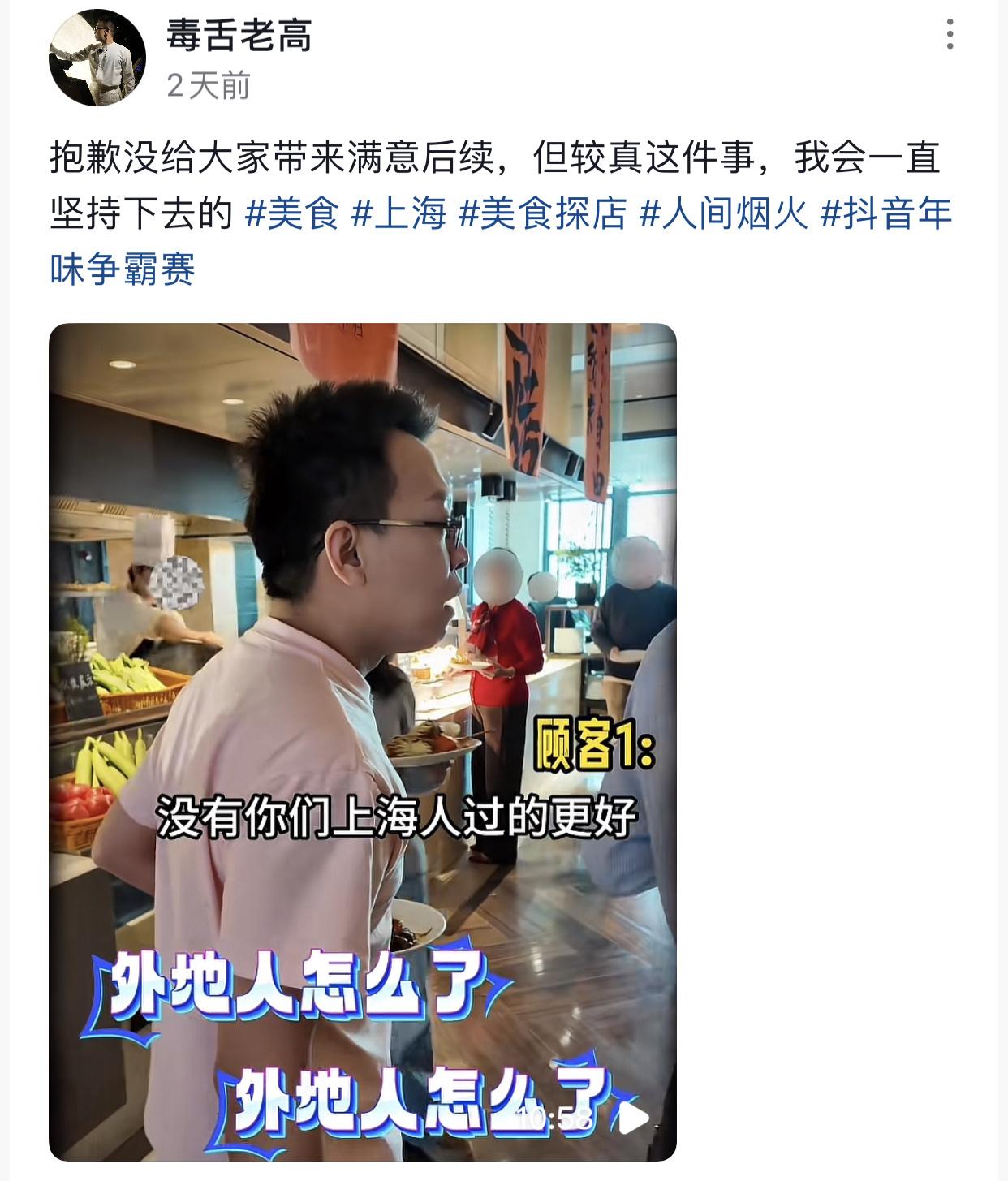 花钱吃上海五星级自助结果被土著大妈看不起,上到值班经理,下到本地顾客都在护犊子。 起因是博主老高自掏腰包打卡上海五星级自助餐酒店,宣传上写的大闸蟹不限量供应,实际上每人每次只能拿两只,美其名曰怕顾客浪费,之后想再吃还要再次排队。 博主想吃羊排,结果发现羊排和生蚝放在一个区域,但由于拿生蚝需要排队,导致拿羊排的人也跟着一起排队。 博主从厨师和餐厅经理那里确认拿羊排不需要排队可以直接取之后。便绕过队伍想取羊排,结果旁边排队拿生蚝的土著大妈突然急了张口大喊别插队。 博主跟他理论说那边一大盘羊排都是已经做好了的,可以直接拿,大妈拿好羊排就可以往旁边靠一靠继续等生蚝,让其他需要羊排的人先拿,不要挡在前面不让后面的人拿。 但是大妈就是不听,反复强调博主想要就去排队,还说在上海就要守上海人的规矩,没有你们这些外地人更好。 老高越说越气,周围顾客全都劝他一个大老爷们别计较。最让他感到无语的是酒店处理方式,员工们看着顾客因为餐品摆放问题吵架,站在旁边看热闹不解决。 经理看老高发火了才不情不愿过来,甚至连什么情况都没弄清楚就对博主说她们这里都是要有秩序,意思就是说博主没有排队,被生气的博主怼了一通后她才跑出去了解情况,结果了解完情况回来后也只是一味的道歉,全程都在搪塞,拿排队现拿都是为顾客着想当说辞。却丝毫没有对“餐品摆放易引发误会”“大妈地域言论”等问题给出解决方案。 就连之后博主明确指出螃蟹的品质问题,MOD却一直嘴硬,坚称自家供货商是经过多方面筛选对比具备正规资质的,全程回避自身问题,挖空心思找理由搪塞。