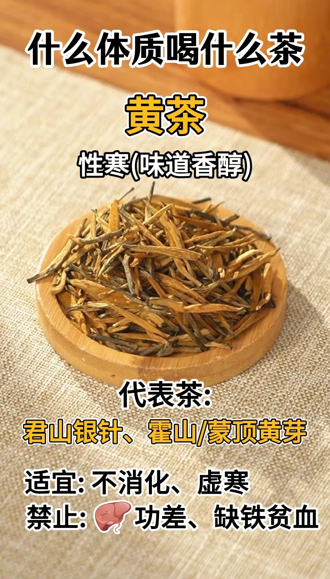黄茶性凉,适合消化差、没胃口、脾胃虚的人。代表茶有君山银针、蒙顶黄芽。但孕妇、失眠人群要避开。