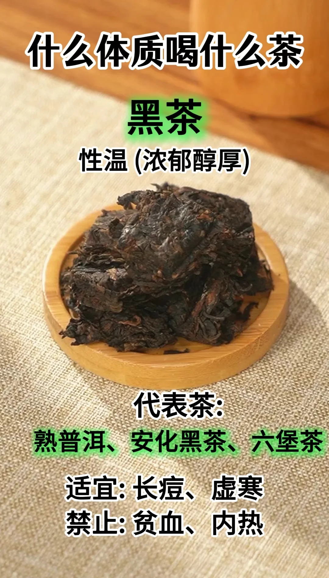 黑茶性温,适合三高、肠胃弱需调理的人。代表茶有普洱、六堡茶。但贫血、低血糖者要慎选。