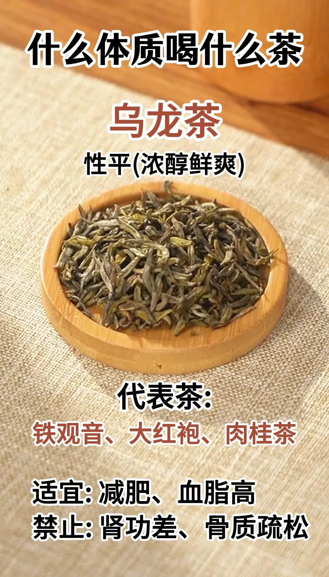 乌龙茶性中,适合减脂期、久坐肚子胀、口干的人。代表茶有铁观音、大红袍、凤凰单丛。但别空腹喝。