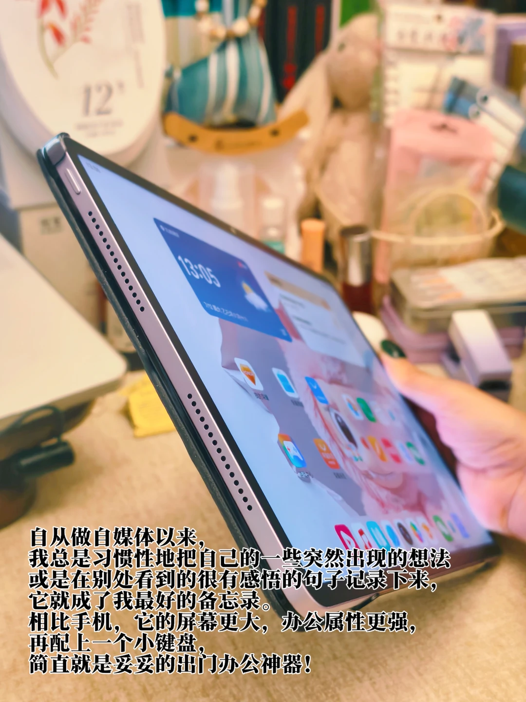 这款平板是我最近入手的一个宝藏办公好搭子。紫色的配色刚好长在了我的审美点上,办公流畅度更是让我对它的喜爱值拉满!自从做自媒体以来,我总是习惯性地把自己的一些突然出现的想法或是在别处看到的很有感悟的句子记录下来,它就成了我最好的备忘录。相比手机,它的屏幕更大,办公属性更强,再配上一个小键盘,简直就是妥妥的出门办公神器!