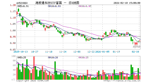 2月10日,港股通科技ETF富国(520860)涨0.33%,成交额1574.34万元。当日份额减少600.00万份,最新份额为7.15亿份,近20个交易日份额减少8400.00万份。最新资产净值计算值为6.60亿元。