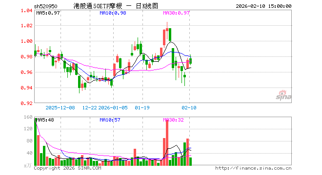 港股通50ETF摩根(520950)业绩比较基准为恒生港股通50指数收益率(经汇率调整后),管理人为摩根基金管理(中国)有限公司,基金经理为何智豪,成立(2025-10-29)以来回报为-2.33%,近一个月回报为0.97%。