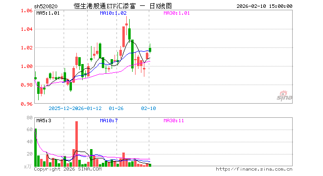 恒生港股通ETF汇添富(520820)业绩比较基准为恒指港股通指数收益率(经估值汇率调整后),管理人为汇添富基金管理股份有限公司,基金经理为晏阳,成立(2025-11-19)以来回报为2.06%,近一个月回报为2.08%。