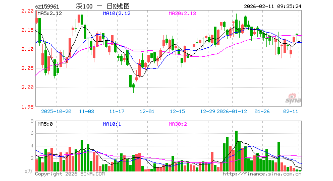 2月11日,深100ETF方正富邦(159961)开盘跌0.23%,报2.130元。深100ETF方正富邦(159961)重仓股方面,宁德时代开盘涨0.53%,中际旭创跌0.85%,新易盛跌0.77%,美的集团跌0.24%,东方财富跌0.17%,立讯精密跌0.58%,阳光电源跌0.50%,比亚迪涨0.08%,五粮液跌0.18%,胜宏科技跌0.77%。