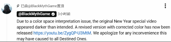 游戏科学无疑也发现了这一问题,随后他们便进行了内容的换源,并发布了致歉公告:“由于色彩空间问题,此前发布的新年特别视频画面比预期效果偏暗。该问题已在此版本中修复。我们为此可能给各位天命人带来的不便深表歉意。”