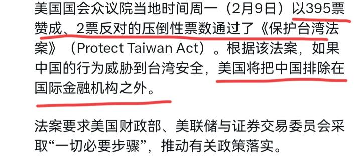 美国完全没有把我们的警告听进去,美国做了一个硬动作声称,如果中国的行为威胁到台湾安全,美国将把中国排除在国际金融机构之外。这种拿国际规则当筹码,干涉中国内政的做法,简直是霸道到了极点。 美国想让台湾蹭国际金融机构的边,根本站不住脚。国际货币基金组织、世界银行都是联合国下属的专门机构,加入的门槛就是必须是主权国家。 之前美国众议院还通过过所谓 “不歧视台湾法案”,想让台湾加入 IMF、参与相关活动,国台办直接戳破:台湾作为中国的一部分,根本没这个资格。 现在美国又升级威胁,想用排除中国来给 “台独” 撑腰,本质上就是在破坏国际规则,干涉中国内政。 再说说美国这个威胁本身,纯属纸上谈兵,根本行不通。当今世界经济早就连在一起,中国是世界第二大经济体,也是第一大贸易国,和 120 多个国家和地区是主要贸易伙伴。 2022 年中国对世界经济增长的贡献率超过 30%,全球金融体系离了中国根本玩不转。把中国排除出去,就相当于把全球经济的重要支柱拆掉,引发的连锁反应谁都扛不住。 美国自己也离不开中国的经济合作。2022 年中美经贸额接近 7000 亿美元,美国企业在华有大量投资,赚得盆满钵满。 中国还持有超过一万亿美元的美国国债,是美元体系的重要支撑者。 真要是把中国排除出国际金融机构,美元的霸权地位会受重创,美国的金融市场也会剧烈动荡,到时候美国老百姓的生活都会受影响,物价上涨、就业困难,这些后果美国政客根本不敢真的面对。 国际金融机构也不是美国的私人俱乐部,不是它想怎样就怎样。 这些机构的重大决策需要成员国共同投票,欧盟、东盟、金砖国家等很多经济体都和中国有紧密的金融联系,不可能跟着美国一起做损害自己利益的事。 美国之前就常搞单边制裁,把金融机构当政治工具,已经让很多国家不满。现在又想故技重施,只会让更多国家对现有国际金融体系失去信任,加速体系的碎片化。 更有意思的是,美国这么做反而会帮中国加速摆脱对现有体系的依赖。 这些年中国早就做好了准备,人民币跨境支付系统(CIPS)已经覆盖全球 180 多个国家和地区,越来越多的国际贸易开始用人民币结算。 还有亚洲基础设施投资银行(亚投行)、金砖国家新开发银行,这些新兴多边金融机构的影响力越来越大,已经成为国际金融体系的重要补充。 美国的威胁,只会让更多国家主动和中国加强金融合作,反过来削弱美国主导的金融秩序。 美国拿金融制裁当威胁,也不是第一次了。之前他们就以各种理由制裁中国企业和个人,禁止美国公民和公司和这些中企打交道,冻结他们在美国的资产。 但中方从来没有妥协,每次都采取必要措施维护企业的合法权益,那些被制裁的企业依然能正常开展业务,美国的制裁根本没达到预期效果。 现在想用更极端的手段威胁中国,显然是打错了算盘。 台湾问题是中国的内政,任何外部势力都无权干涉。中国政府解决台湾问题、实现祖国统一,是在行使自己的主权,符合国际法和国际关系基本准则。 美国把台湾问题和国际金融制裁绑在一起,就是想搞 “以台制华”,阻止中国发展。但他们忘了,维护国家主权和领土完整,是全中国人民的共同意志,这种意志不是任何外部威胁能动摇的。 中国一直尽最大努力争取和平统一,但这绝不意味着我们会容忍 “台独” 分裂行径,会放任外部势力干涉。 解放军的实力不断增强,在台海周边的演训常态化开展,就是在震慑 “台独” 分裂势力和外部干涉者。 美国的算盘打得再精,也改变不了历史大势。“台独” 分子想靠美国撑腰分裂国家,最终只会是死路一条。 美国想靠金融威胁阻止中国统一,不仅行不通,还会让自己付出沉重代价。中美关系的健康发展,需要双方遵守一个中国原则和中美三个联合公报,而不是美国单方面挑衅、施压。 现在的中国,已经不是几十年前那个可以任人拿捏的国家了。我们有强大的经济实力、完善的金融布局、坚定的民族意志,还有遍布全球的合作伙伴。 美国的金融威胁,就像纸老虎一样,看着吓人,实则不堪一击。真要是敢付诸行动,只会让美国自己在国际上更加孤立,加速其霸权的衰落。 中国政府和中国人民在台湾问题上的立场一以贯之,没有任何退让的余地。任何企图分裂自己国家的人,任何企图干涉他国内政的势力,都必将遭到历史的唾弃和应有的惩罚。 祖国完全统一的历史大势,是谁也阻挡不了的,美国的霸道行径,最终只会成为阻碍中国统一进程中的一个笑话。