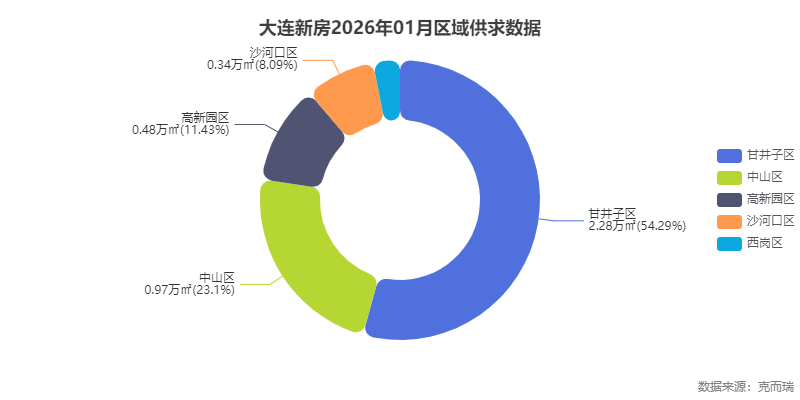 克而瑞数据显示,2026年1月甘井子区新房成交面积2.28万㎡,占全市总量54.4%,远超其他四区之和。这印证了甘井子区作为大连楼市“主战场”的地位,而泉水板块作为甘井子重要组成部分,自然成为开发商关注焦点。