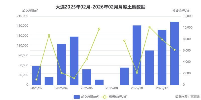克而瑞数据显示,2026年1月大连土地市场成交总建面达19.3万㎡,楼板价6135元/㎡,虽较2025年11月高点有所回落,但成交量创近半年新高,显示市场活跃度正在恢复。