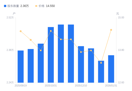 日期A股户数(户)流通A股户均持股数(股)户均持股市值(万元)2026-01-31235806877.3610.012025-12-31233456946.609.262025-12-20238766791.959.372025-12-10239736764.479.292025-11-30249056511.329.252025-11-28249056511.329.252025-10-31247966539.029.492025-10-20240816733.179.292025-09-30238506798.399.642025-09-19237856802.289.86