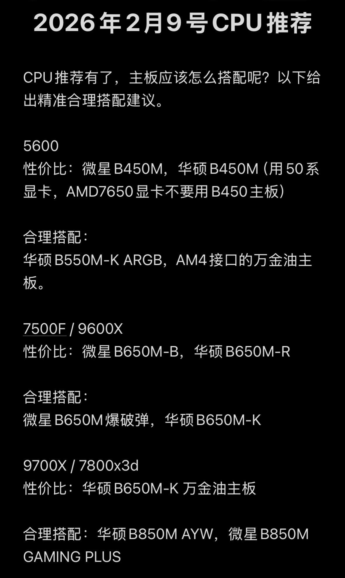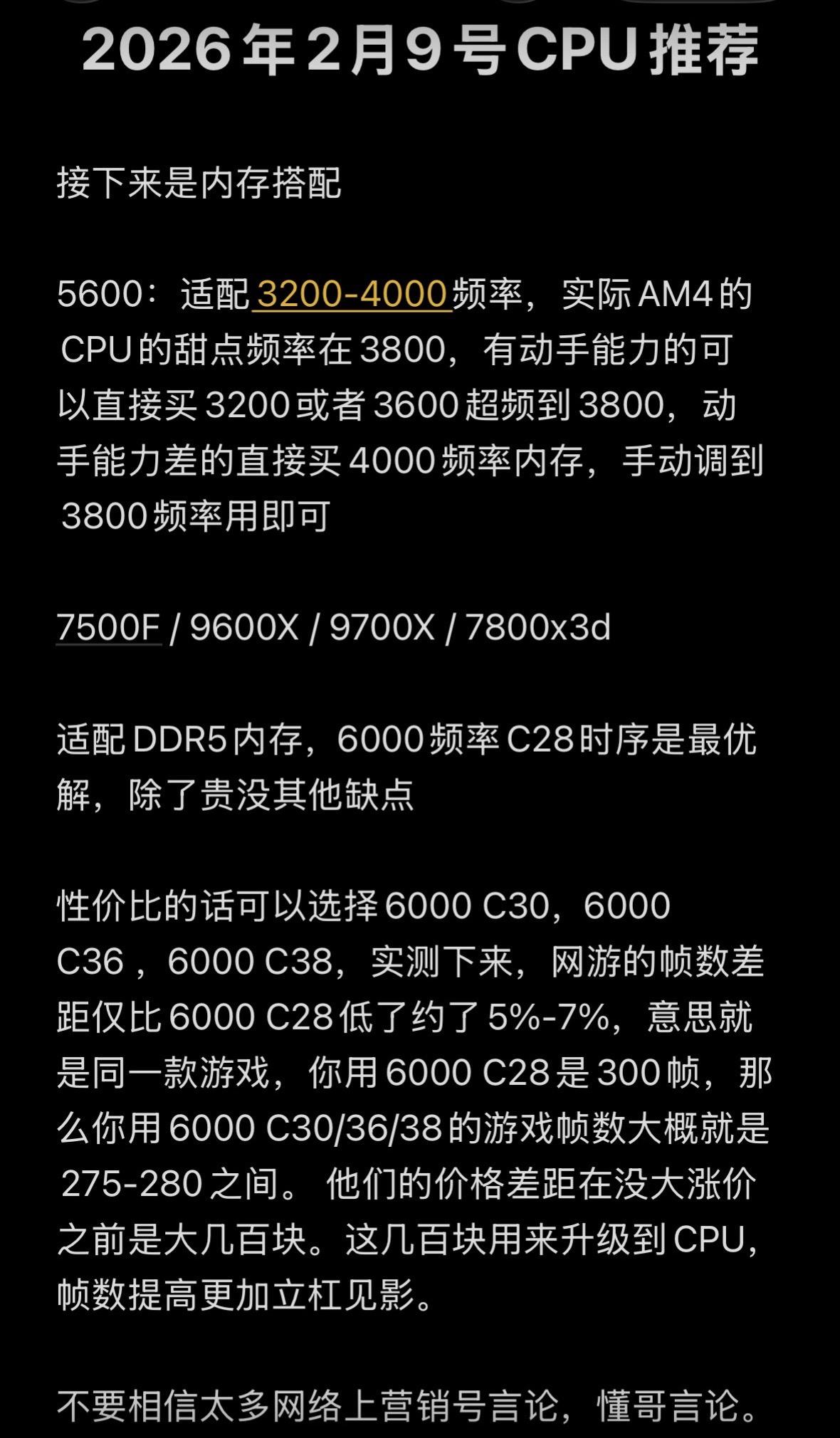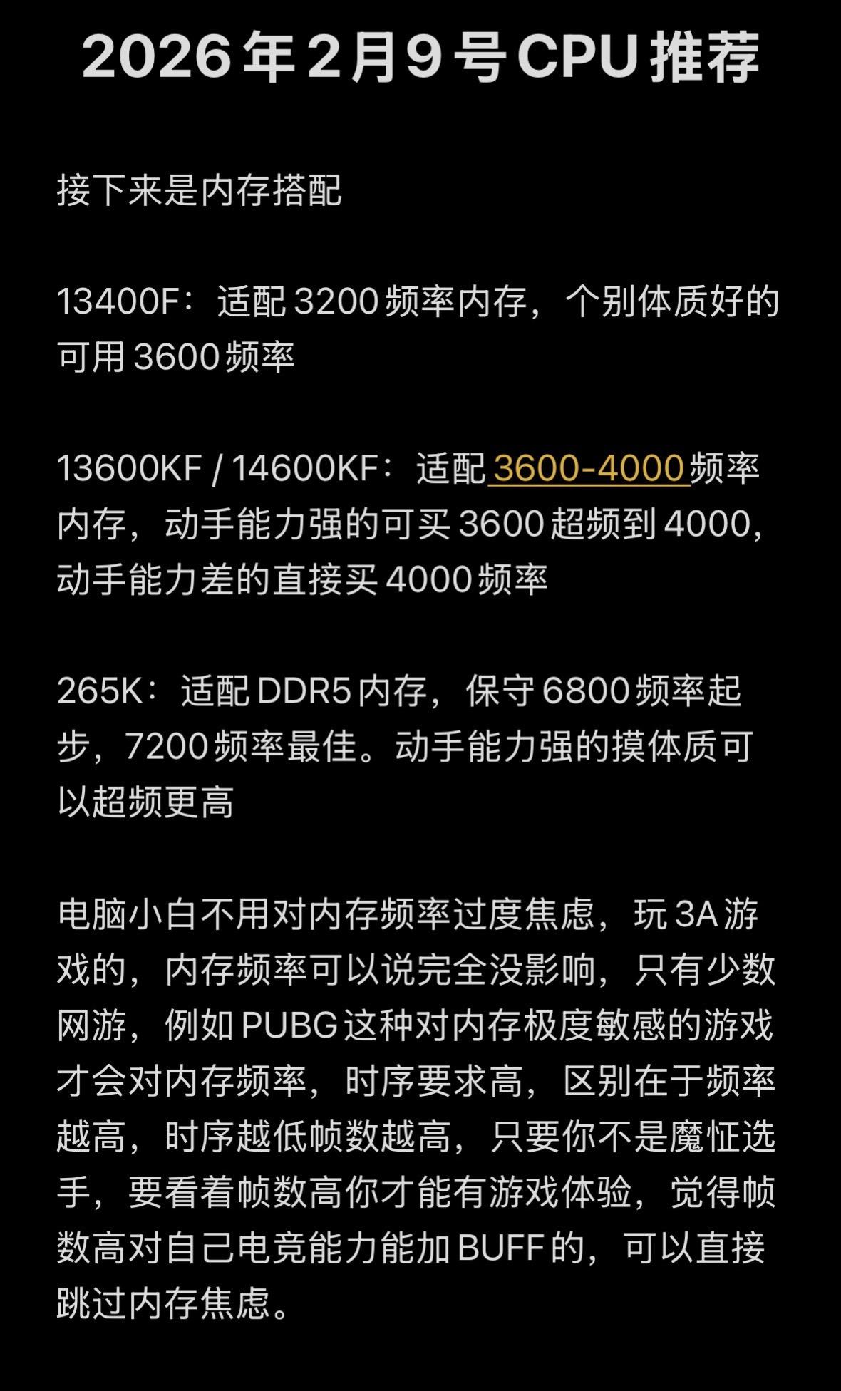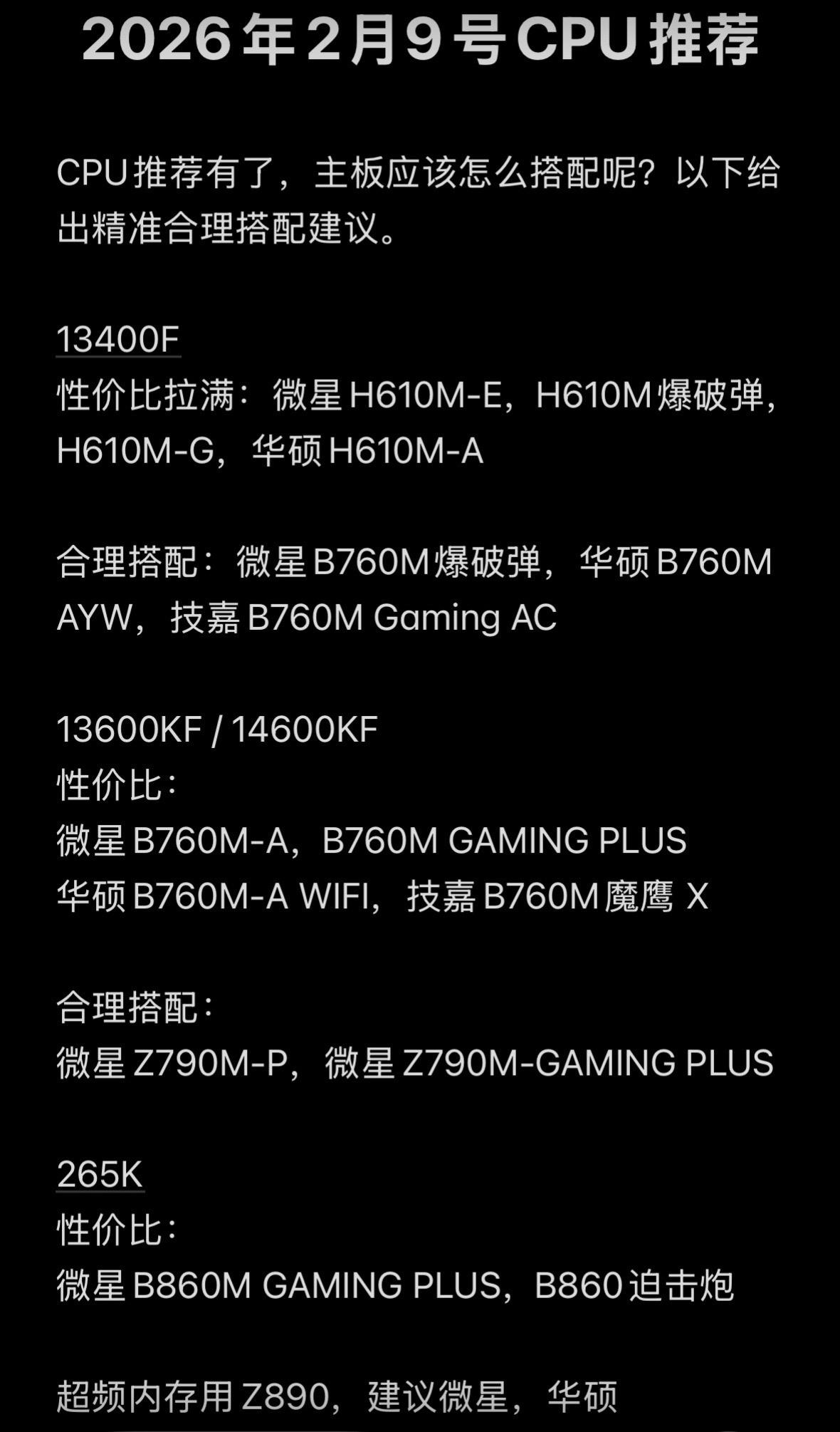 2026年2月CPU推荐以及搭配。热门性价比CPU你选对了吗?英特尔目前13600KF性价比最高,265K第二。AMD遗憾大多数只支持D5。
