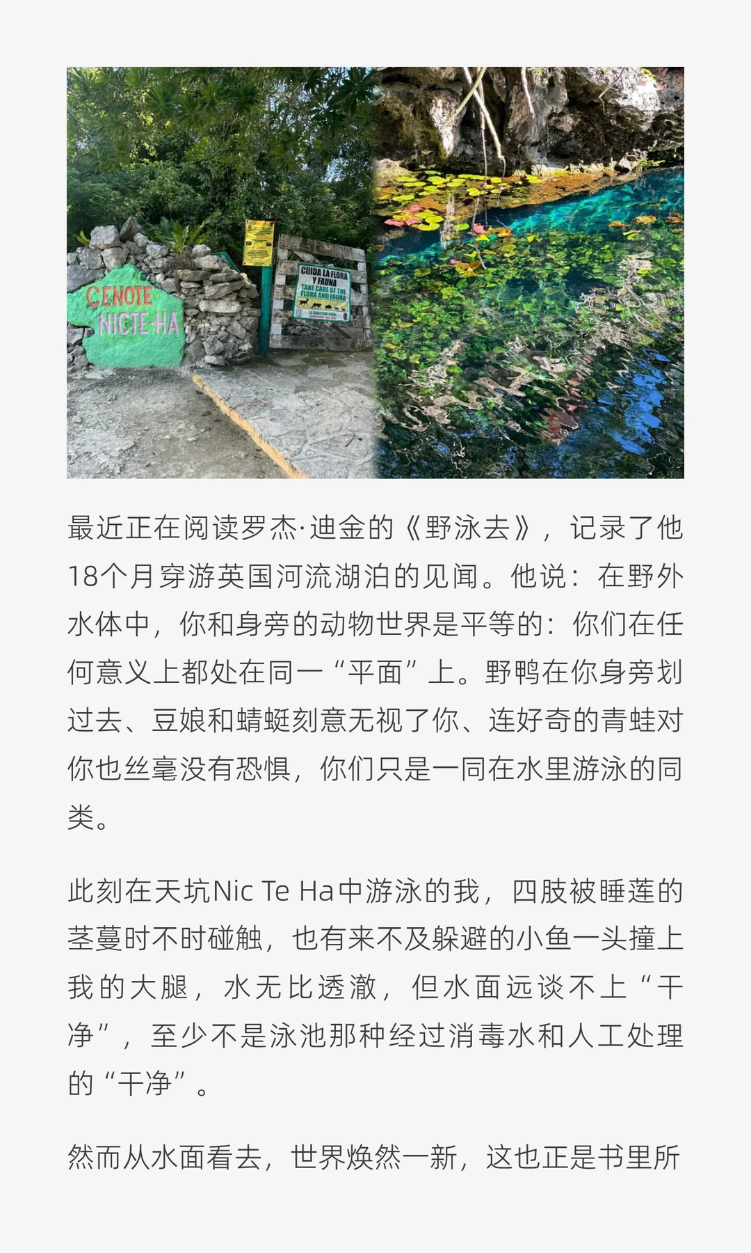 四肢被睡莲的茎蔓时不时碰触,也有来不及躲避的小鱼一头撞上我的大腿,然而从水面看去,世界焕然一新,你和身旁的动物世界是平等的。