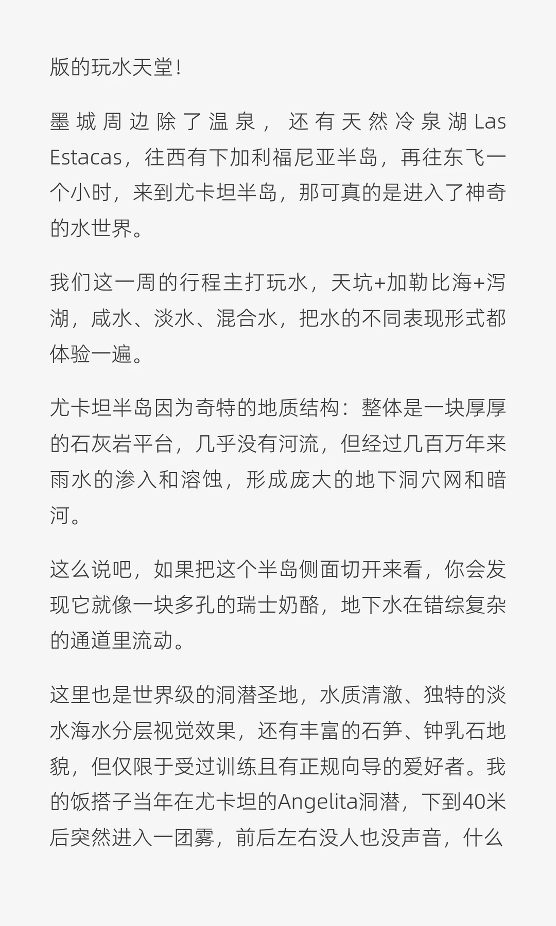 尤卡坦半岛因为奇特的地质结构:整体是一块厚厚的石灰岩平台,几乎没有河流,但经过几百万年来雨水的渗入和溶蚀,形成庞大的地下洞穴网和暗河。