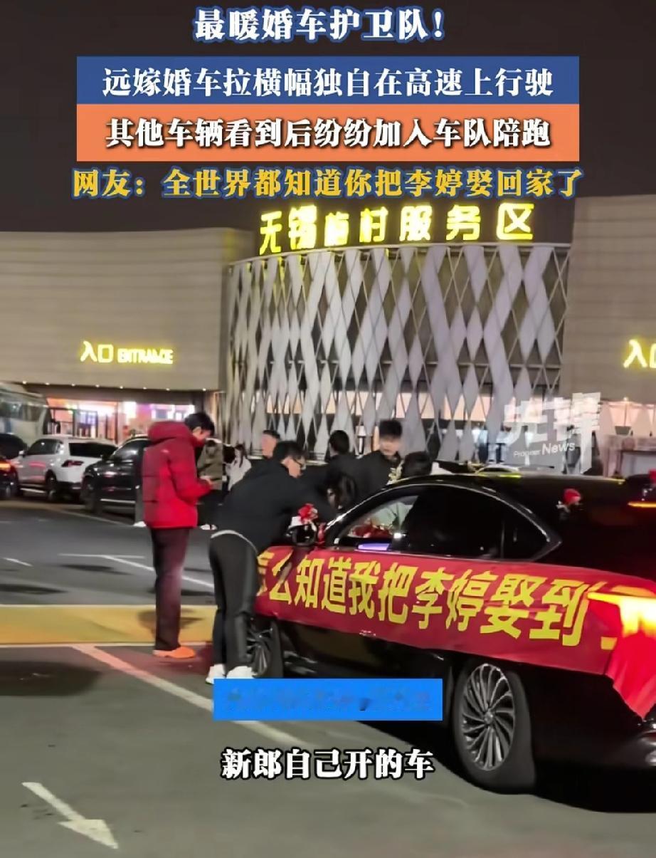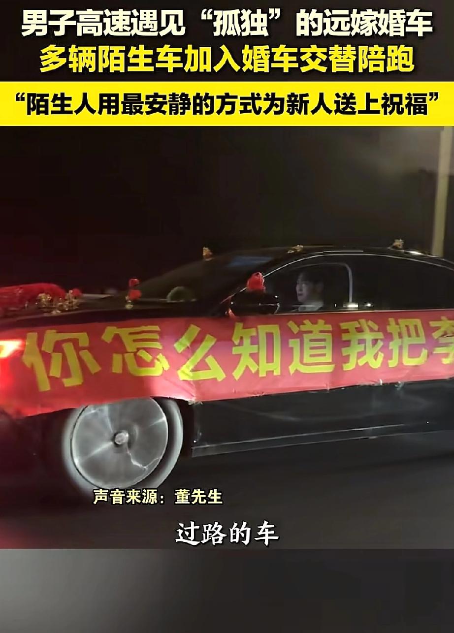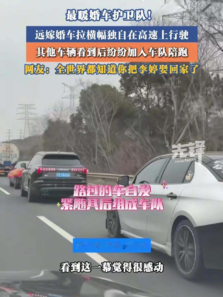 看哭了!过年回家的高速上,董先生偶遇了一辆特别的婚车。它孤零零地开着,车身上贴着一行骄傲又有点“嘚瑟”的大字:“你怎么知道我才李婷娶到了”。原来,这是一位新郎自己开车,正把远嫁的新娘从上海接回河南。而接下来发生的事,让无数人湿了眼眶。 长途高速上,只有一辆贴着喜字的车。没有庞大的车队,没有热闹的亲友,只有一对新人。 起初,只是有几辆经过的车,放慢速度,摇下车窗,朝他们笑着挥手、鸣笛。仿佛在说:“恭喜呀!” 没想到,这份善意像会传染。很快,越来越多的车加入了进来。有人闪两下大灯,有人并排开一小段,还有人特意开到前面“领路”。 他们互不相识,却默契地组成了一支临时“护航车队”,交替陪伴着这对新人。孤独的婚车,就这样被陌生的温暖,一程一程地送向远方。 有网友说:“不知怎么,眼泪就流了下来……在这常常显得破破烂烂的世间,总有人像一束光,默默照亮角落。”是啊,这份陌生人之间不言而喻的守护,恰恰是中国人骨子里最朴素的善良。 也有网友幽默祝福:“这回好了,全国人都知道你娶到李婷了,必须白头到老!”这话让人笑着鼻子一酸。所有路人的祝福,此刻都成了他们婚姻的见证人。 还有网友想起了自己心酸地说:“我没远嫁,我嫁了本村,可弟弟结婚后带着爸妈定居浙江,我全家‘远嫁’了。”戳中了无数远嫁和分离家庭的软肋——原来,离别有很多种模样,而那份不舍与牵挂,是相通的。 看,我们为什么感动?因为它不只关于爱情,更关于每个普通人心里那份柔软的善意,和那份对“团圆”深深的渴望。 最好的婚礼排场,不是豪车成群,而是这一路未曾预约的温暖。即便人生路远,即便旅途孤独,但请你相信,总会有人愿意为你亮起一束微光,陪你走一段。 祝福李婷和她的新郎,也要谢谢那些不知名的过客。是你们,让一条平凡的高速路,变成了一条流淌着爱的河流。人间或许寒冷,但善意,永远是最暖的归途。