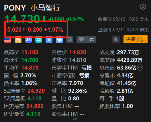 格隆汇2月11日|小马智行港股上涨2.6%,带动小马智行(PONY.US)美股盘前涨约2%。消息上,北京时间今日凌晨,国际指数编制公司MSCI公布季度指数评审结果,其中,小马智行港股获纳入MSCI中国指数,有关变动将于2月27日收市后生效。公司被纳入MSCI中国指数,是获得国际资本市场认可的重要里程碑,其好处是多层次且深远的,核心在于提升流动性、优化投资者结构并增强公司声誉。