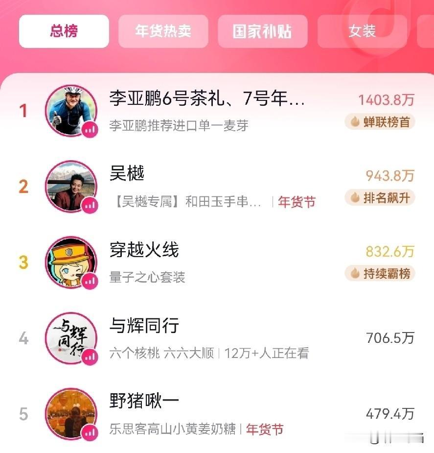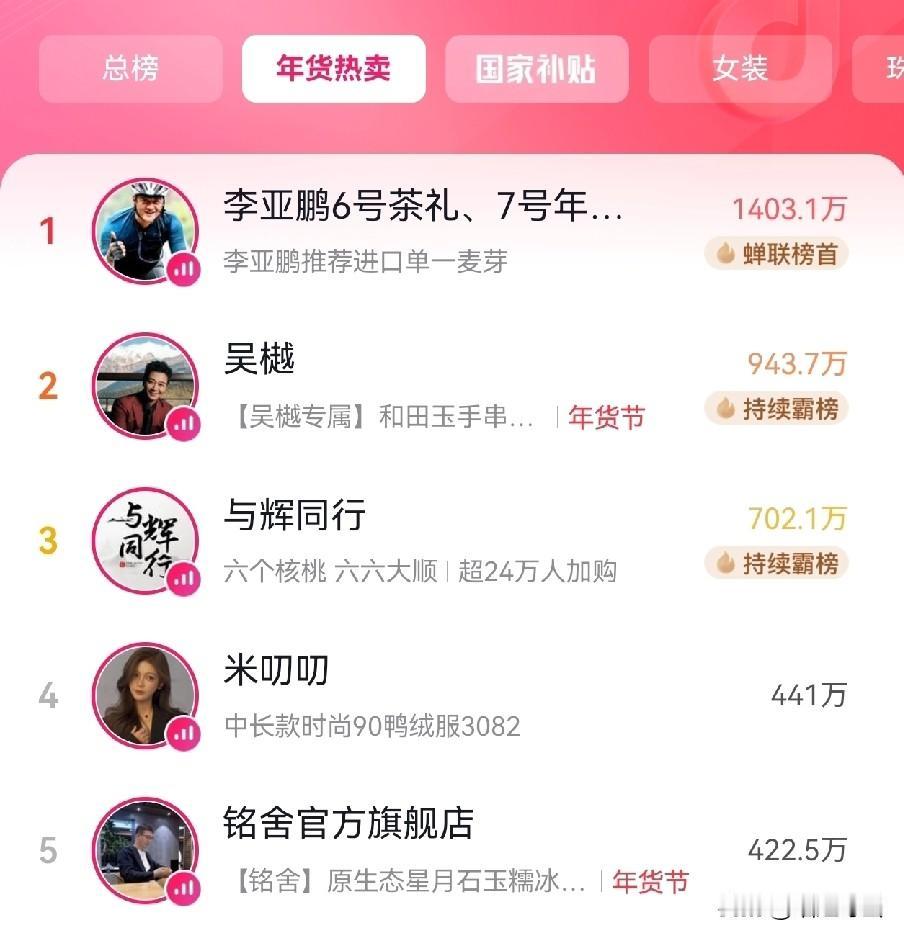 李亚鹏大概做梦也没想到,自己默默坚持的善心善行,居然以这种方式回报了自己。他的直播间,年货热卖榜首,总榜榜首,且是“蝉联榜首”! 成功超越了“与辉同行”,我们常说的,但行好事莫问前程在李亚鹏身上终于得到了验证。看着李亚鹏不急不躁地讲解,忽然发现李亚鹏真的是一个很有内涵的人,文化素养也是很深厚的。 只要看到他的直播间,就特别想感谢他的女儿李嫣,李嫣真的是降落人间的天使啊!因为她的到来,她的爸妈才会成立嫣然基金和嫣然医院,拯救了上万名唇腭裂宝宝,给上万个家庭带去了希望。感谢李亚鹏的爱心,十几年如一日的坚持,太令人感动了。李亚鹏 李先生大爱[祈祷][祈祷]