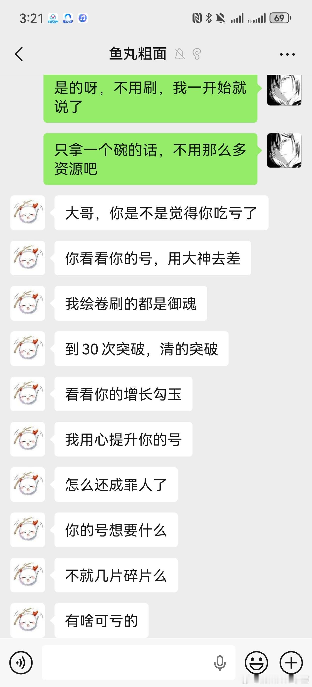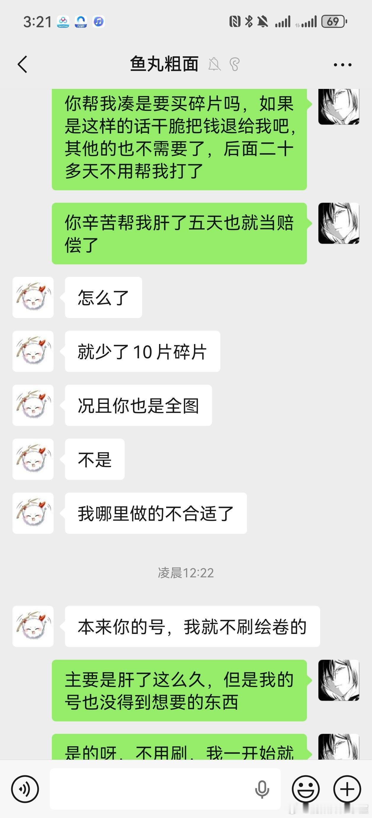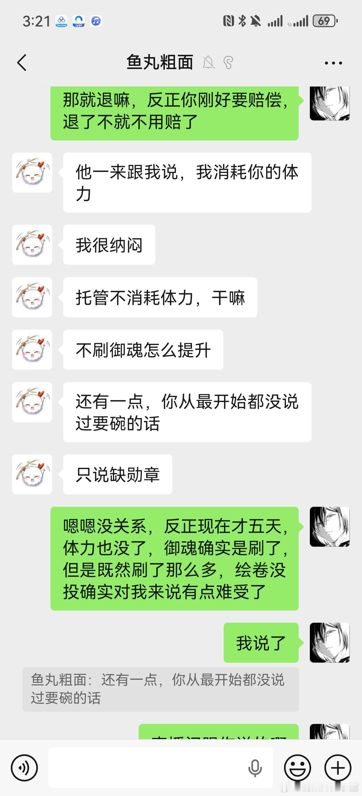 他说花钱给我弄一个碗,8000体力打御魂你就只能刷出一个碗来?我不接受这种赔偿,原本要求全额退款,对方不愿意,后来我退一步要求这5天就当付费了,剩下25天给我退款,他也不退。