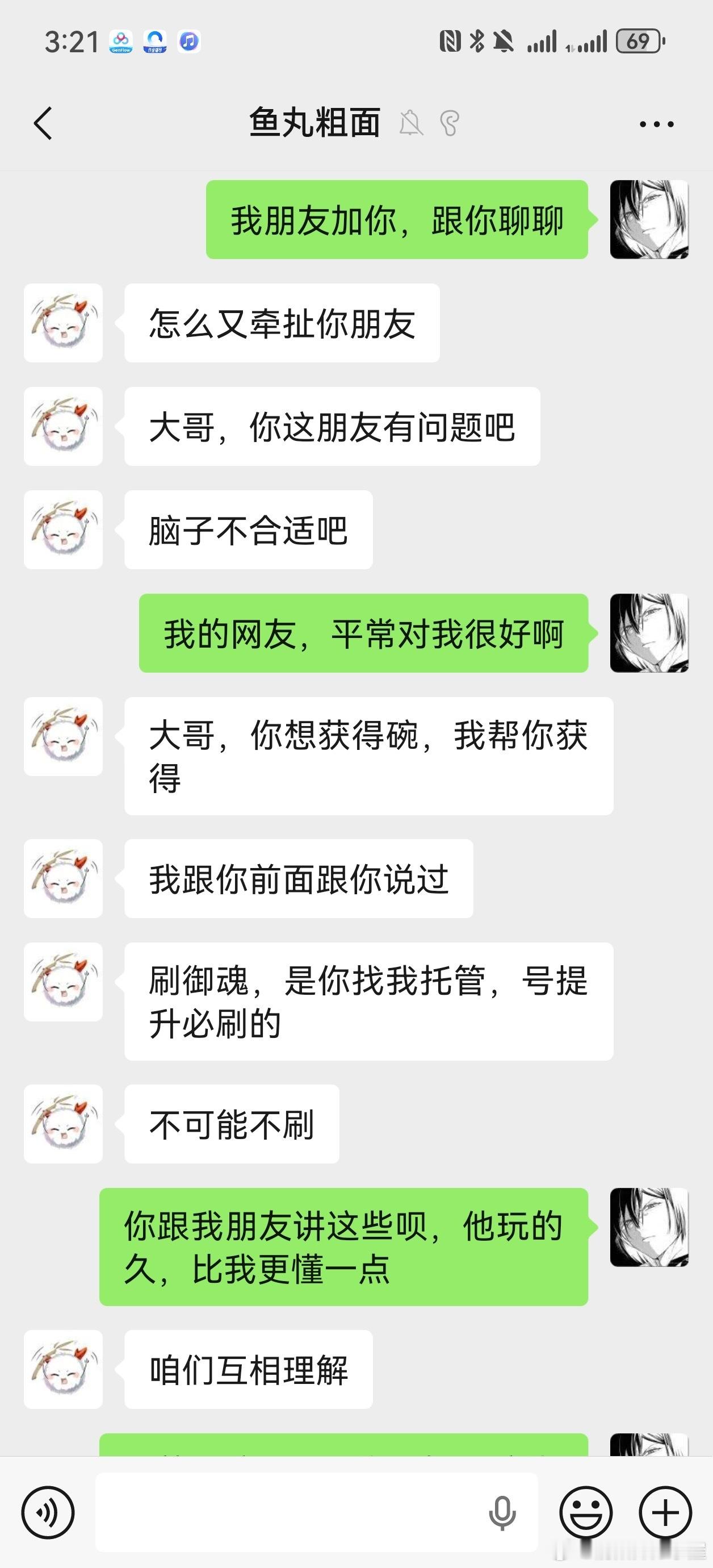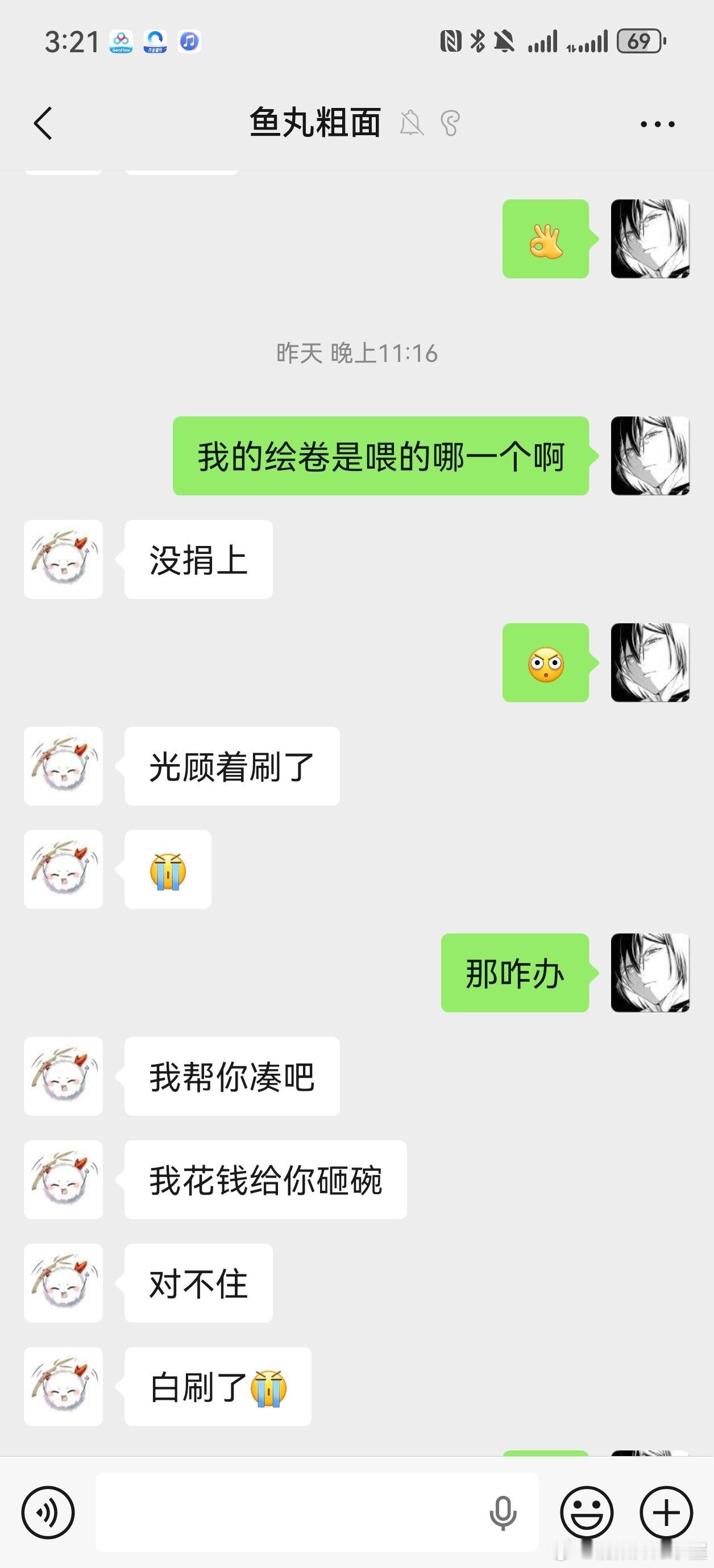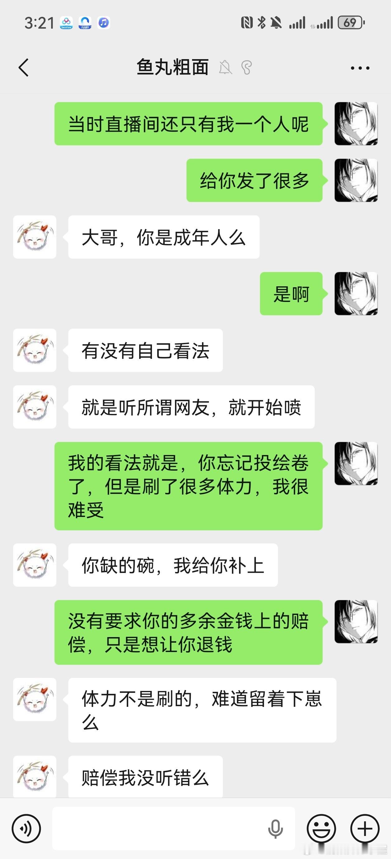 他说花钱给我弄一个碗,8000体力打御魂你就只能刷出一个碗来?我不接受这种赔偿,原本要求全额退款,对方不愿意,后来我退一步要求这5天就当付费了,剩下25天给我退款,他也不退。
