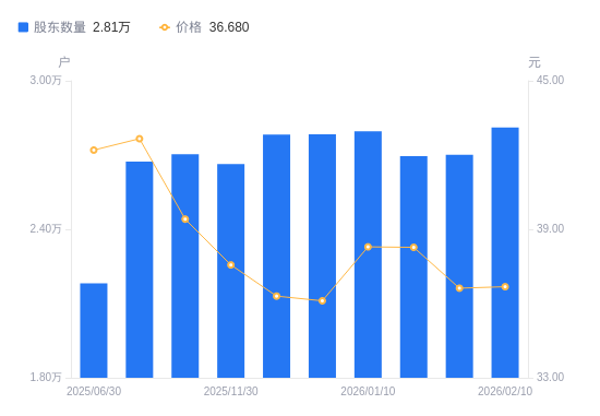 日期A股户数(户)流通A股户均持股数(股)户均持股市值(万元)2026-02-10281147305.1326.802026-01-31270117603.4327.842026-01-20269577618.6729.162026-01-10279617345.1028.122025-12-31278407377.0226.642025-12-20278307379.6826.792025-11-30266397683.5928.862025-10-31270287573.0029.852025-09-30267347656.2832.662025-06-30218169373.7639.56