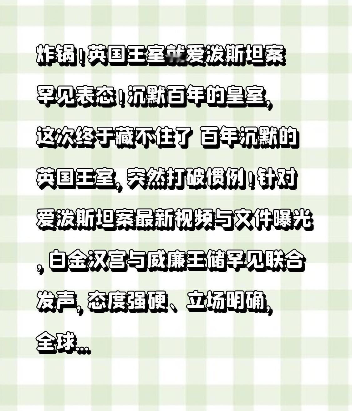 炸锅!英国王室就爱泼斯坦案罕见表态!沉默百年的皇室,这次终于藏不住了 百年沉默的英国王室,突然打破惯例!针对爱泼斯坦案最新视频与文件曝光,白金汉宫与威廉王储罕见联合发声,态度强硬、立场明确,全球舆论瞬间炸锅! 一直以来,英国王室对丑闻向来“不回应、不评论、不道歉”,尤其是安德鲁王子涉案多年,王室始终闭口不谈,任由外界猜测,给权贵遮羞、护短的质疑声从未停止。爱泼斯坦羞辱性视频、飞行日志、受害者证词接连曝光,直指安德鲁王子参与未成年性交易,王室形象跌至谷底。 就在舆论即将失控时,历史性转折点出现!当地时间2月9日,查尔斯三世通过白金汉宫发布重磅声明:以“前所未有的行动”表达深切关切,明确表态全力配合警方调查,若警方接洽,王室绝不推诿;同日,威廉与凯特首次公开站队,强调心系受害者,谴责一切虐待行为。 为划清界限,王室动作不断:剥夺安德鲁所有头衔、军衔与王室赞助人身份,勒令搬离温莎城堡皇家小屋,彻底踢出核心圈层,从王子贬为普通家族成员,断特权、冷处理,用最决绝的方式切割自保。 有人说这是正义到来,有人吐槽是危机公关。但无论如何,这是英国王室百年以来,首次对权贵性丑闻如此明确表态,意味着特权不再是护身符,皇室也不能凌驾真相之上。 真相从不会被权力掩埋,正义从不会因身份迟到。无论是王子还是平民,无论是皇室还是普通人,伤害未成年人、践踏法律与良知,终将被钉在耻辱柱上。 王室的低头,是对受害者的告慰,更是对全世界的警示:没有谁能只手遮天,没有罪恶能永远隐藏。愿所有受害者得到公正,愿所有罪恶被彻底清算! 点赞转发,关注后续进展,让真相大白于天下!