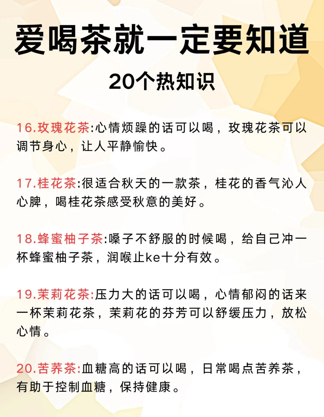 19. 茉莉花茶清香怡人,压力大、心情郁闷时饮用,花香舒缓,放松身心与情绪。