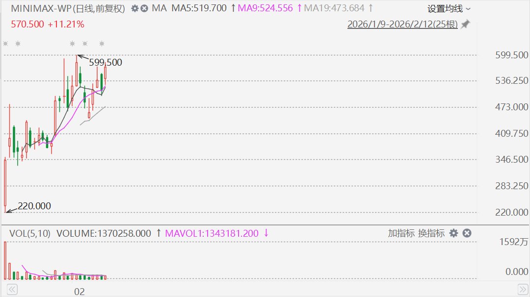 MiniMax-WP(0100.HK)盘中大涨13%,报580港元,市值超1800亿港元。消息面上,据悉M2.5模型即将正式上线,目前MiniMaxM2.5模型已在海外的MiniMaxAgent产品进行内测。