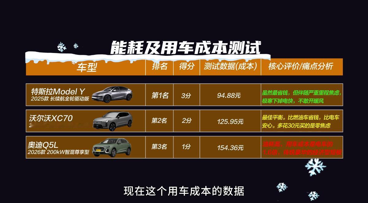 油车、插混、电车极寒对决!零下20度谁才是真正实力派? 近日,有媒体在零下20℃的东北,对三款热门中型SUV——奥迪全新Q5L、沃尔沃全新XC70与特斯拉Model Y,展开了一场涵盖极寒升温、座舱空间、冰雪坡道起步、能耗与用车成本等八大维度的全面测试。 前几轮比拼中,三车可谓势均力敌、互有胜算;无论空间实用性,还是雪地坡道起步表现,都展现出了各自优势。然而在“能耗及用车成本”测试中,沃尔沃全新XC70所搭载的四擎四驱超混系统,则显现了独特优势。 该项测试将进行超200km的双能挑战,既考验车辆能耗,也要综合计算用车成本。纯电的特斯拉Model Y,不出意外斩获用车成本最低;但在极寒高速工况,其电耗显著上升,续航焦虑问题突出。而采用插混动力的沃尔沃全新XC70,则集成了电车低成本+油车续航无忧优势,在200km+测试中,用车成本只比Model Y高出约30元。 值得一提的是,全新XC70这套超混动力,能无感智能切换7种混动模式,市区中低速能当发电机,高速行驶时也能以最优工作区间参与直驱,从而实现对能耗的精准控制。这正是其用车成本显著低于奥迪Q5L,同时保留电驱平顺、响应迅速的关键。 加之,全新XC70具备超1200km综合续航,能彻底告别里程焦虑,足以为用户带来覆盖全场景的豪华智能电感出行体验。