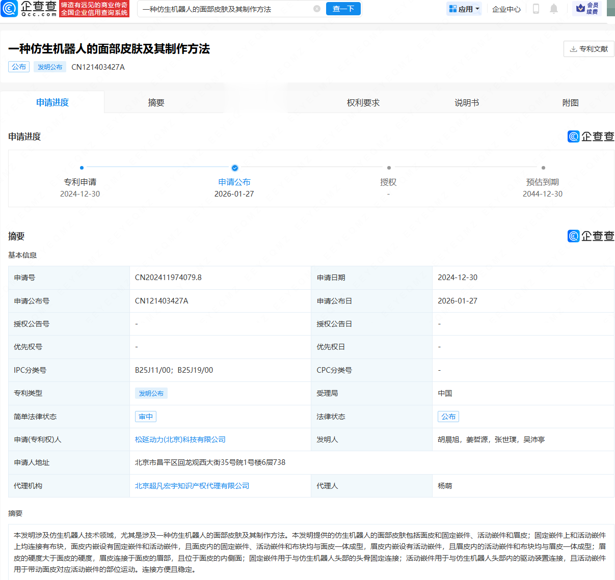 企查查APP显示,近日,北京松延动力科技集团股份有限公司申请公布“一种仿生机器人的面部皮肤及其制作方法”专利。