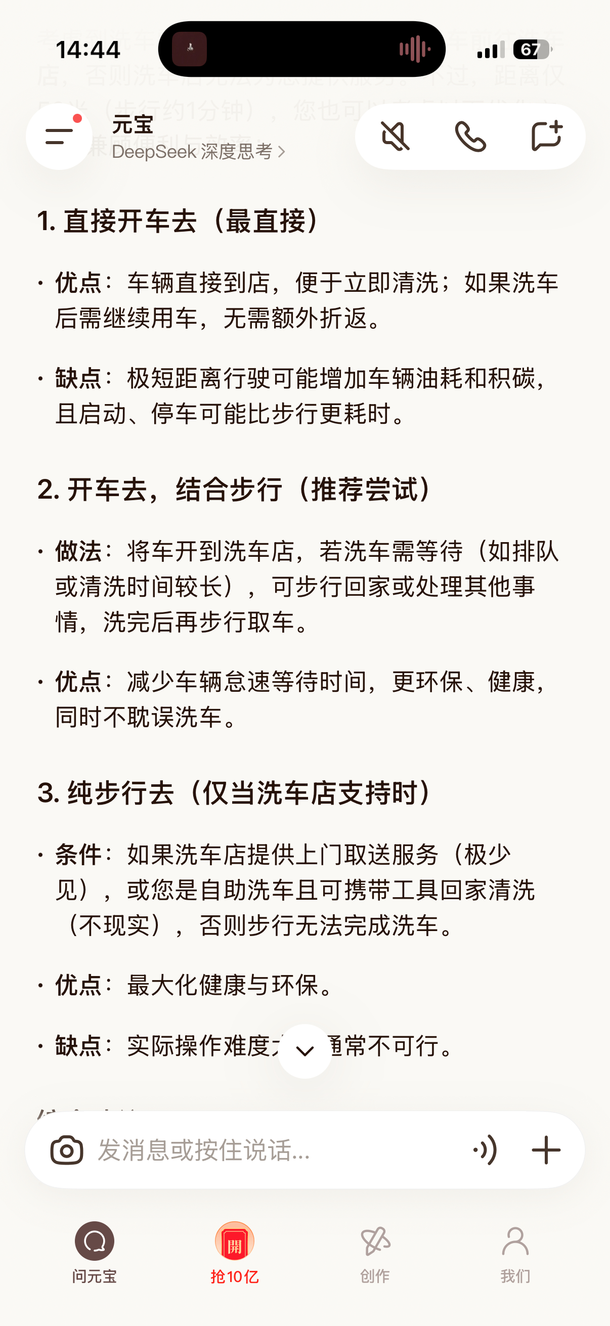 拿千问和元宝试了一下最近很火的洗车问题,元宝用的ds 模型,回答的还可以,还列举