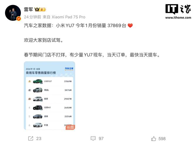 IT之家2月12日消息,今天下午,小米创办人、董事长兼CEO雷军在微博引用“汽车之家”数据发文称,小米YU7今年1月份销量达37869台。雷军进一步透露,小米汽车春节期间门店不打烊,有少量YU7现车,当天订单,最快当天提车。