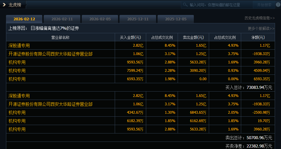 特发信息(000070)今日涨停,成交额33.36亿元,换手率19.59%,盘后龙虎榜数据显示,深股通专用席位买入2.82亿元并卖出1.65亿元,4家机构专用席位净买入1.51亿元,有1家机构专用席位净卖出2500.98万元。
