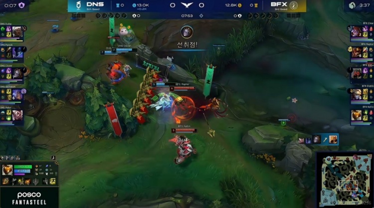 [15:50]DNS拿下先锋,后续团战第一波Pyosik梦魇关灯带球配合队友秒掉了VicLa沙皇,不过Clozer发条也被Raptor皇子盖大强行换掉!残局3V4的BFX还想追击,结果E脸的Diable伊泽瑞尔直接被DuDu安蓓萨贴脸控到强杀,这波DNS逐个击破,团灭BFX!拉开4500的经济差了!