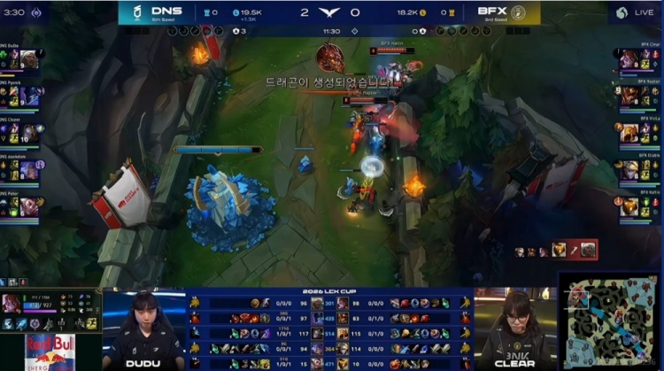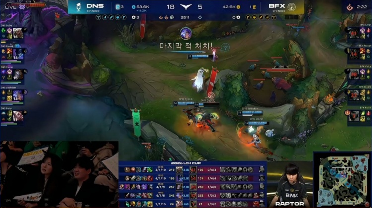 [11:30]BFX主动换线,上路四人集合逮捕了DuDu安蓓萨!不过DNS换掉了二小龙!随后DNS还想入侵,结果没双招的Deokdam芸阿娜白给了!局势又被BFX打回来了!
