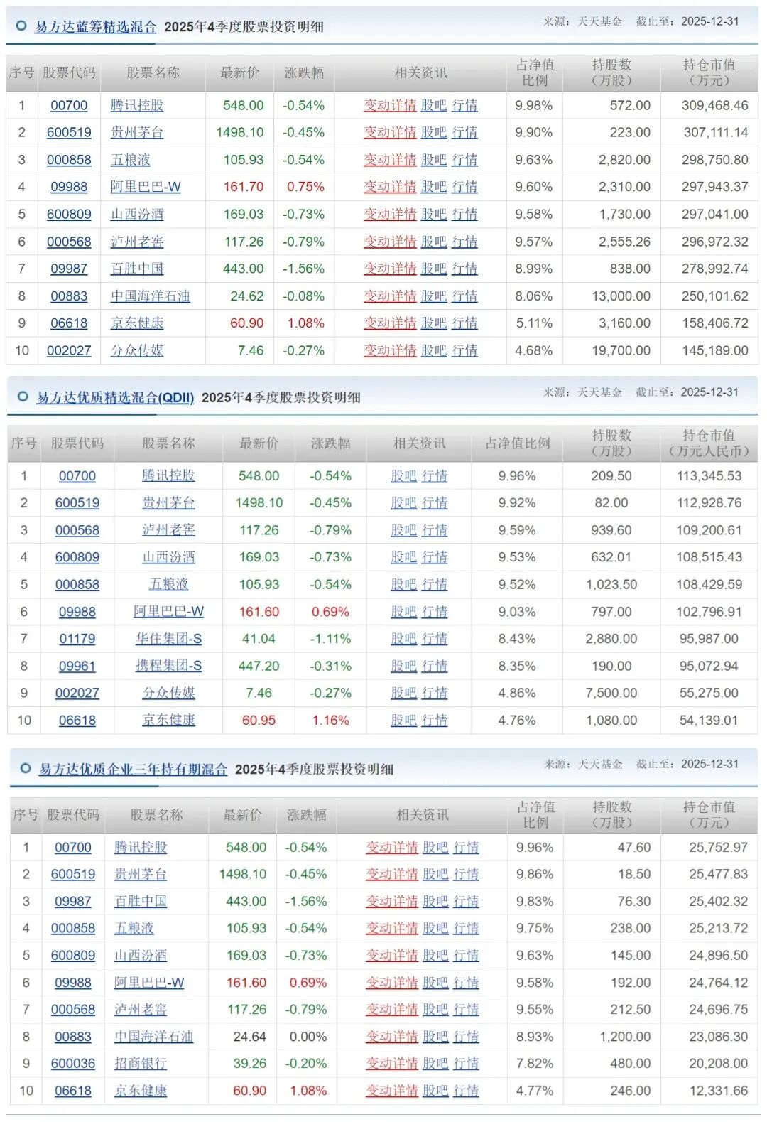 ▲2025年Q4张坤管理基金的前十大重仓股。图源东方财富网。