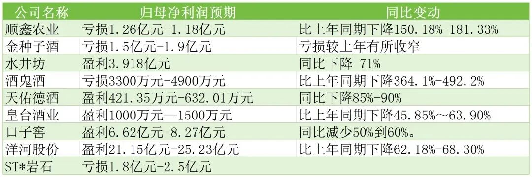 截至2月10日,已有9家白酒上市公司披露业绩预告,其中有4家亏损,另外5家虽然保持盈利,但归母净利润均出现大幅下滑,下滑幅度都在50%以上,甚至有酒企出现了363.1%以上的跌幅。