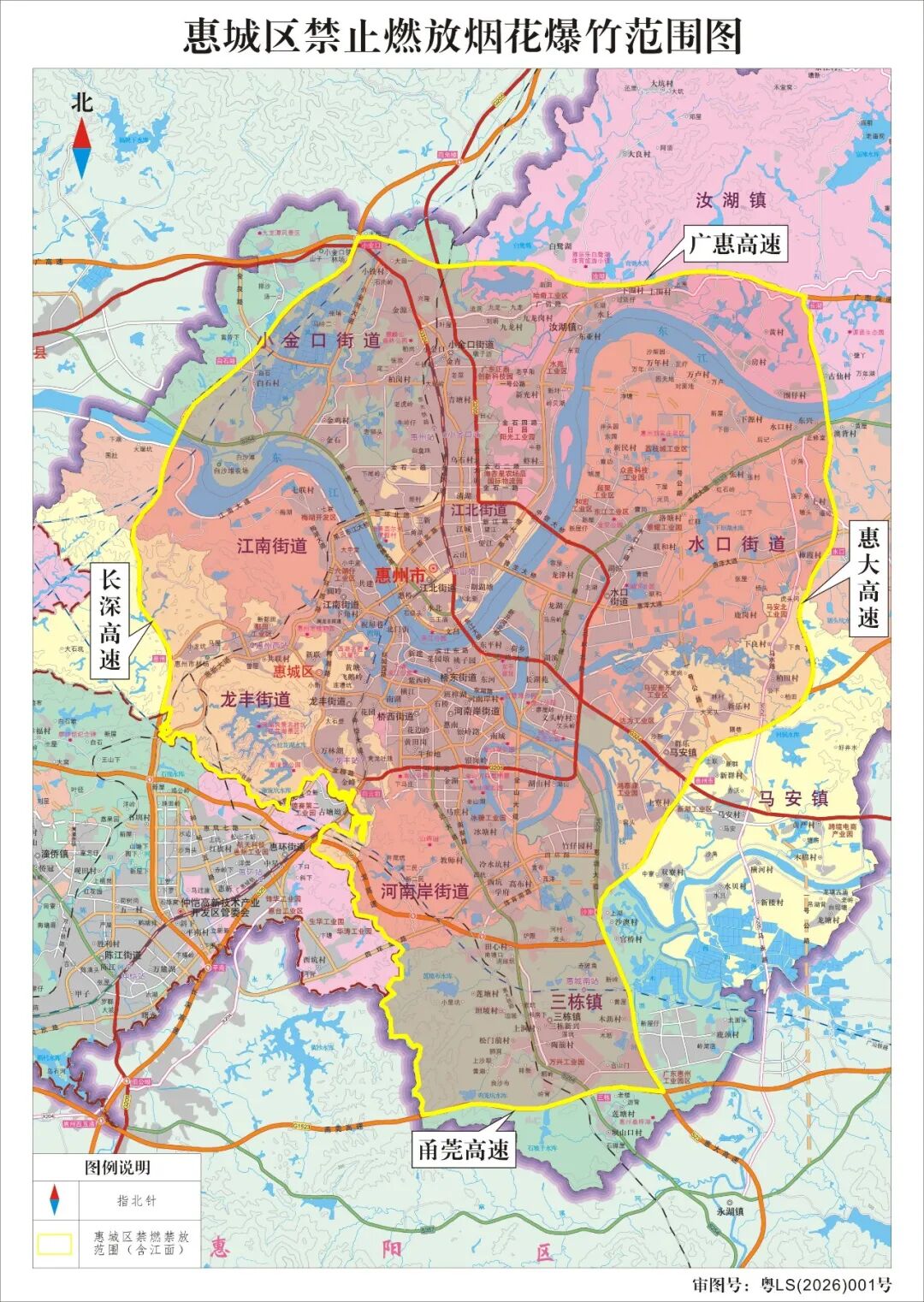 一、惠城区禁止燃放烟花爆竹的范围:东起惠大高速长湖互通、惠大高速,止甬莞高速数码工业园互通以西方向的惠城区管辖区域(含江面);南起甬莞高速数码工业园互通、甬莞高速,止甬莞高速三栋镇与惠阳区交界处以北方向的惠城区管辖区域(含江面);西起甬莞高速三栋镇与惠阳区交界处、甬莞高速三栋镇与惠阳区交界处以北往长深高速龙丰街道与仲恺高新区交界处以东方向的惠城区管辖区域(含江面),再沿长深高速北上,止广惠高速小金口互通以东方向的惠城区管辖区域(含江面);北起广惠高速小金口互通、广惠高速,止惠大高速长湖互通以南方向的惠城区管辖区域(含江面)。