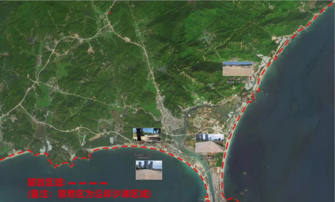 (一)平海镇划定万科9号门停车场空地(约600平方米),万科双月湾四期对出空地(约600平方米)、南门海高登喜岸西北斜对出空旷地处(约500平方米)、高洋尾情人岛驿站西北处(约1000平方米)沙滩区域为限时可燃放区,将18时至22时规定为可燃放时间(红色区域为禁燃范围)。