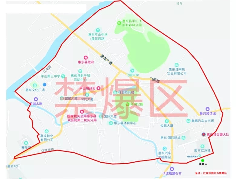 根据《惠东县人民政府关于烟花爆竹在平山、大岭街道、白花镇相关区域禁止销售燃放及在高潭镇、平海镇、港口滨海旅游度假区相关区域限时燃放的通告》(惠东府告〔2024〕3号):