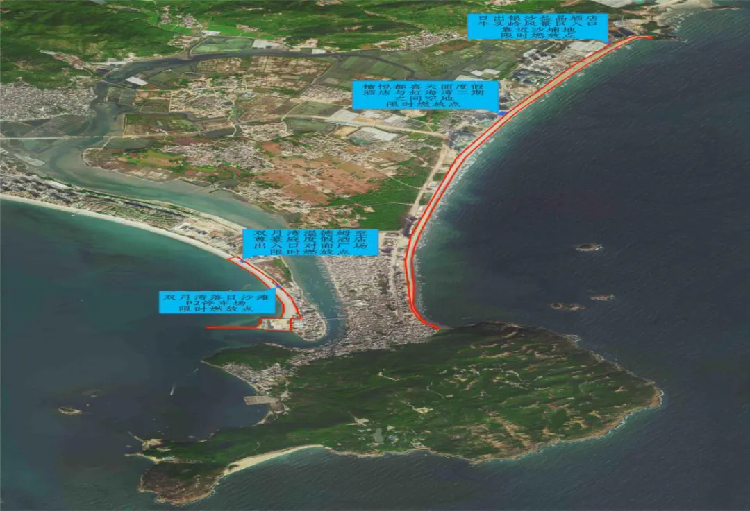 (二)港口滨海旅游度假区划定东山海和沙咀尾靠近沙滩沙浦地附近划定4个空旷沙滩区域(日出银沙盐晶酒店牛头岭风景区入口靠近沙浦地区域;檀悦都喜天丽度假酒店与虹海湾二期之间空地;双月湾温德姆至尊豪庭度假酒店出入口对面广场;双月湾落日沙滩P2停车场对出沙浦地区域)定为限时可燃放区,将18时至22时规定为可燃放时间(红色区域为禁燃范围)。