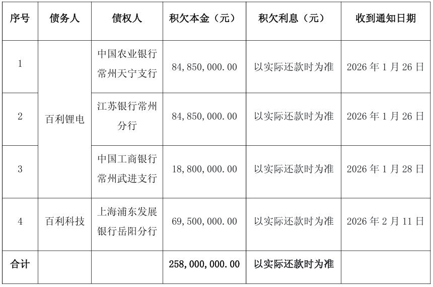 2月12日,百利科技(603959)发布公告,公司及控股子公司百利锂电近期收到多家银行的《贷款提前到期通知书》。由于未按期足额支付利息,公司及百利锂电的贷款被宣布提前到期,需立即偿还积欠本息。