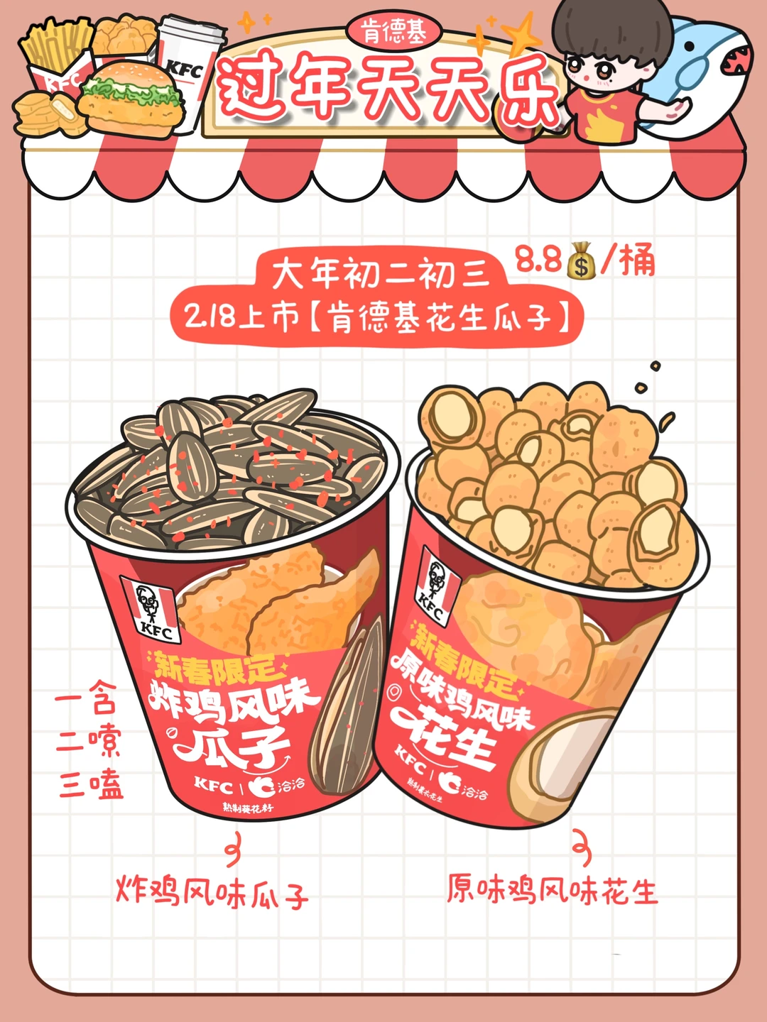 👉大年初二初三:⏰2.18上市【肯德基的花生瓜子】,炸鸡风味瓜子和原味鸡风味花生🥜,只需要8.8r💰/桶