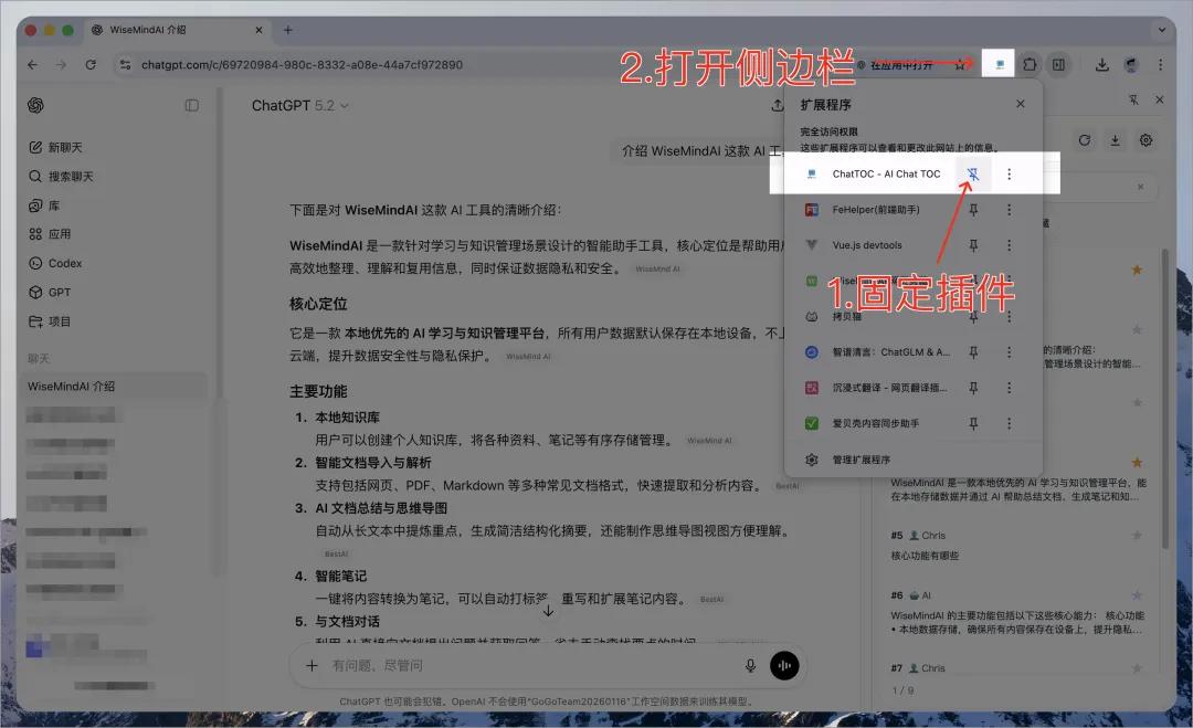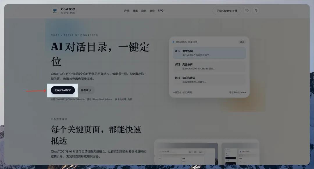 ChatTOC 浏览器插件用来帮助用户在 ChatGPT、Claude、Gemini 等AI对话页面中快速定位消息。通过生成消息目录,用户可以一键跳转到任意消息,并支持搜索、收藏等功能,提升对话记录的效率和可读性。 重要亮点 1.一键定位消息: 生成消息目录,点击即可跳转到任意消息。 2.搜索功能: 输入关键词,自动筛选并高亮匹配的消息。 3.收藏功能: 标记重要消息,方便后续查看。 4.本地处理: 所有处理都在本地浏览器完成,保障用户隐私。 5.多种格式支持: 可导出 JSON/Markdown 格式,方便整理笔记和写作。