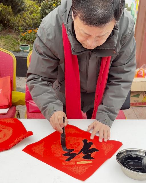 现场吸引了众多旅客驻足观赏、有序领取。市民戴锦泓在书写“福”字后表示:“马上准备写对联,祝来荆州玩的人新年快乐。”正准备迎接对象的市民刘双,则收获了一份特别惊喜:“书法老师把我和对象的名字都嵌到了对联里,这个活动非常有人情味。”她展示着对联,喜悦之情溢于言表。